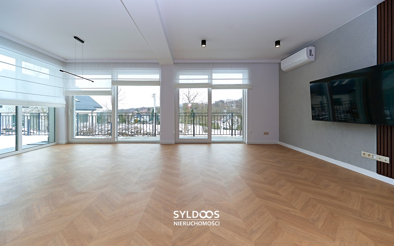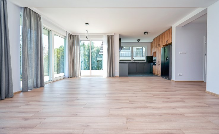 - przestronny salon z aneksem kuchennym (48,40 m²), z wyjściem na taras i widokiem na ogród,