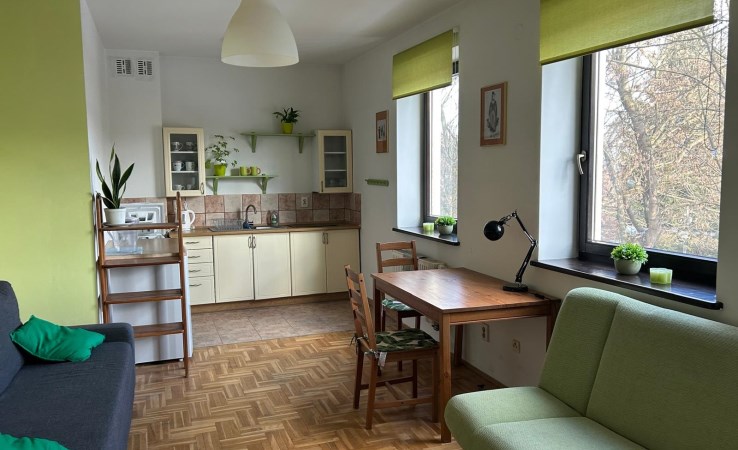 A samo mieszkanie znajdują się na pierwszym piętrze kameralnego apartamentowca. Wnętrze o powierzchni 34,5 m² składa się z przytulnego salonu z aneksem kuchennym, nowocześnie wyposażonym, w tym zmywarka, oraz funkcjonalnej łazienki z wanną. Duży balkon z widokiem na zieleń parkową to doskonałe miejsce na poranną kawę lub relaks po pracy.