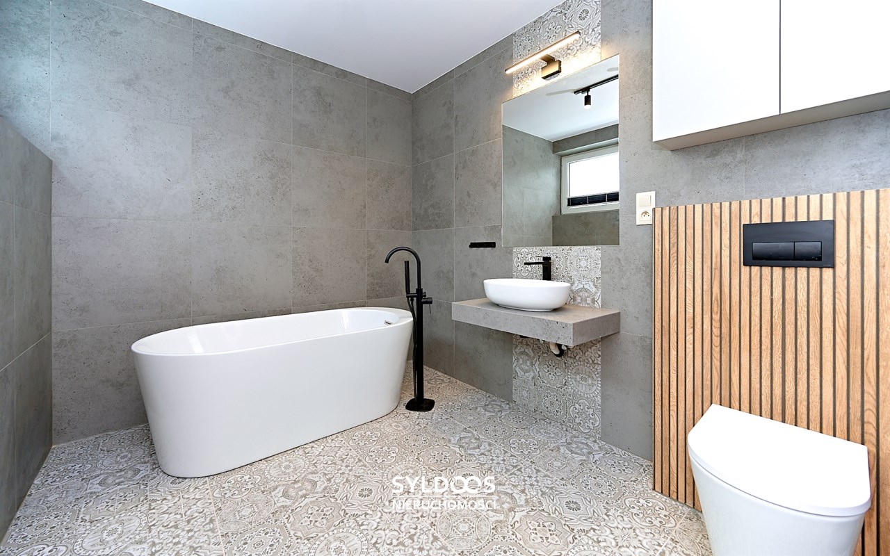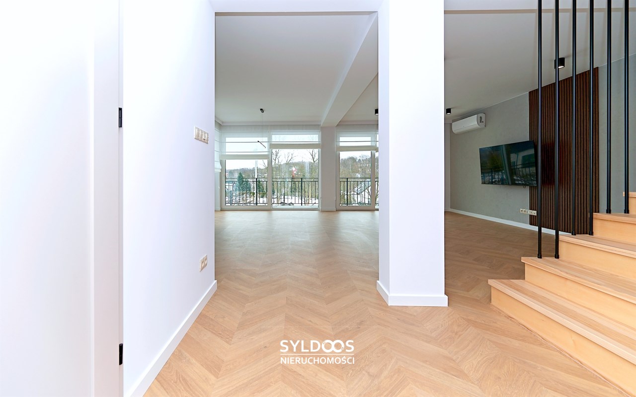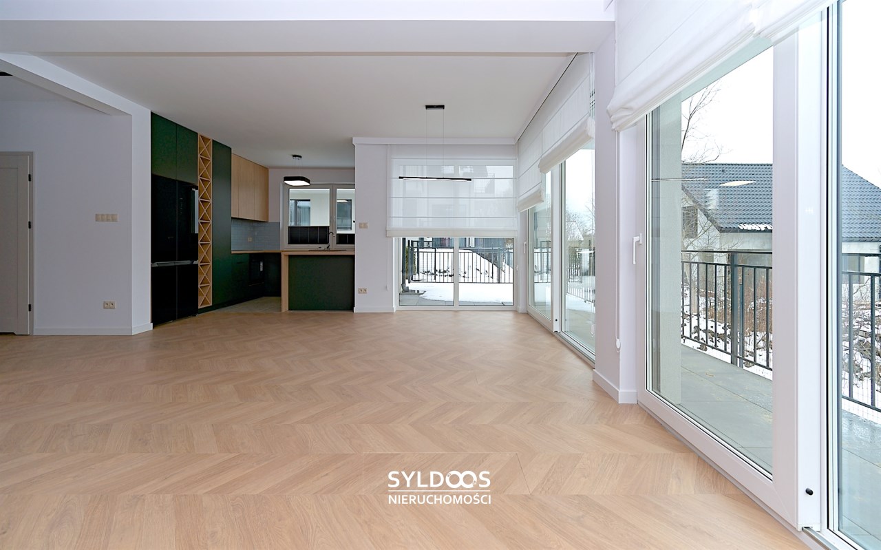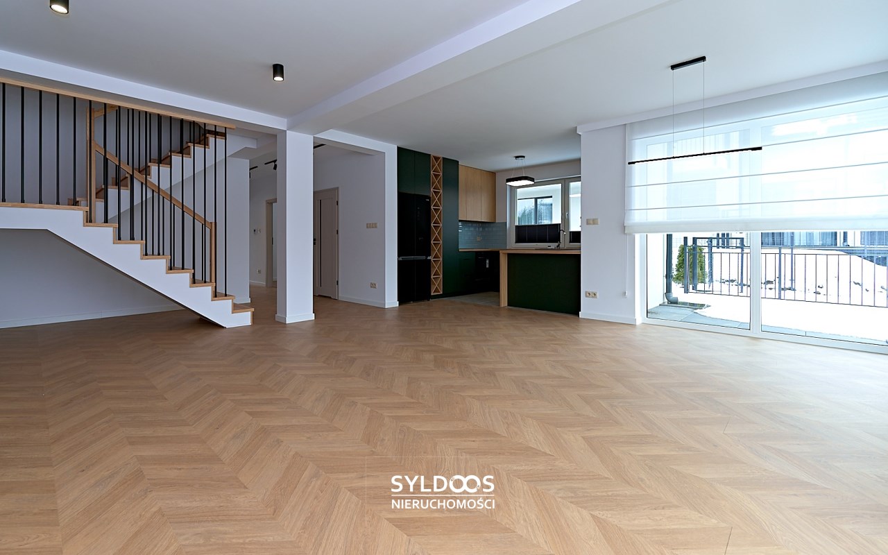 Duży dom w zabudowie bliźniaczej, o bardzo ciekawym rozkładzie pomieszczeń. Kameralna inwestycja, obejmująca jedynie 3 budynki (łącznie 6 domów). Dom jest nowy, wykończony i gotowy do zamieszkania, z dużymi przeszkleniami i funkcjonalnym układem.