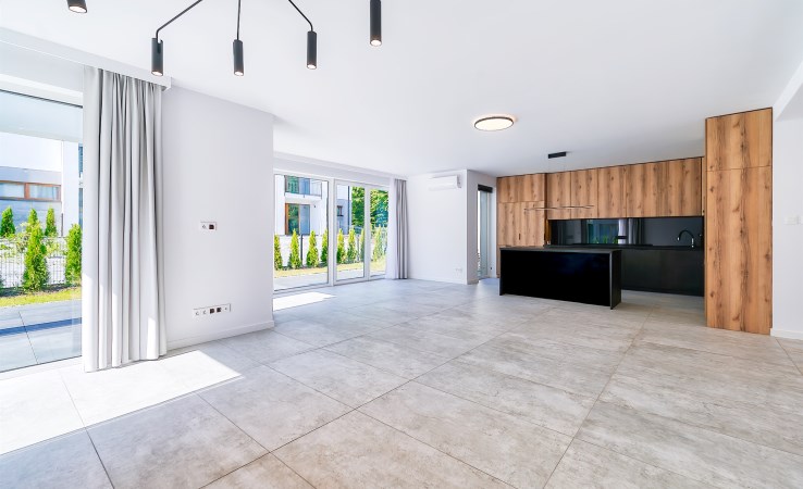 Parter - salon z aneksem kuchennym (32m2) z wyjściem na taras i do ogrodu, gabinet (15m2), toaleta, holl
